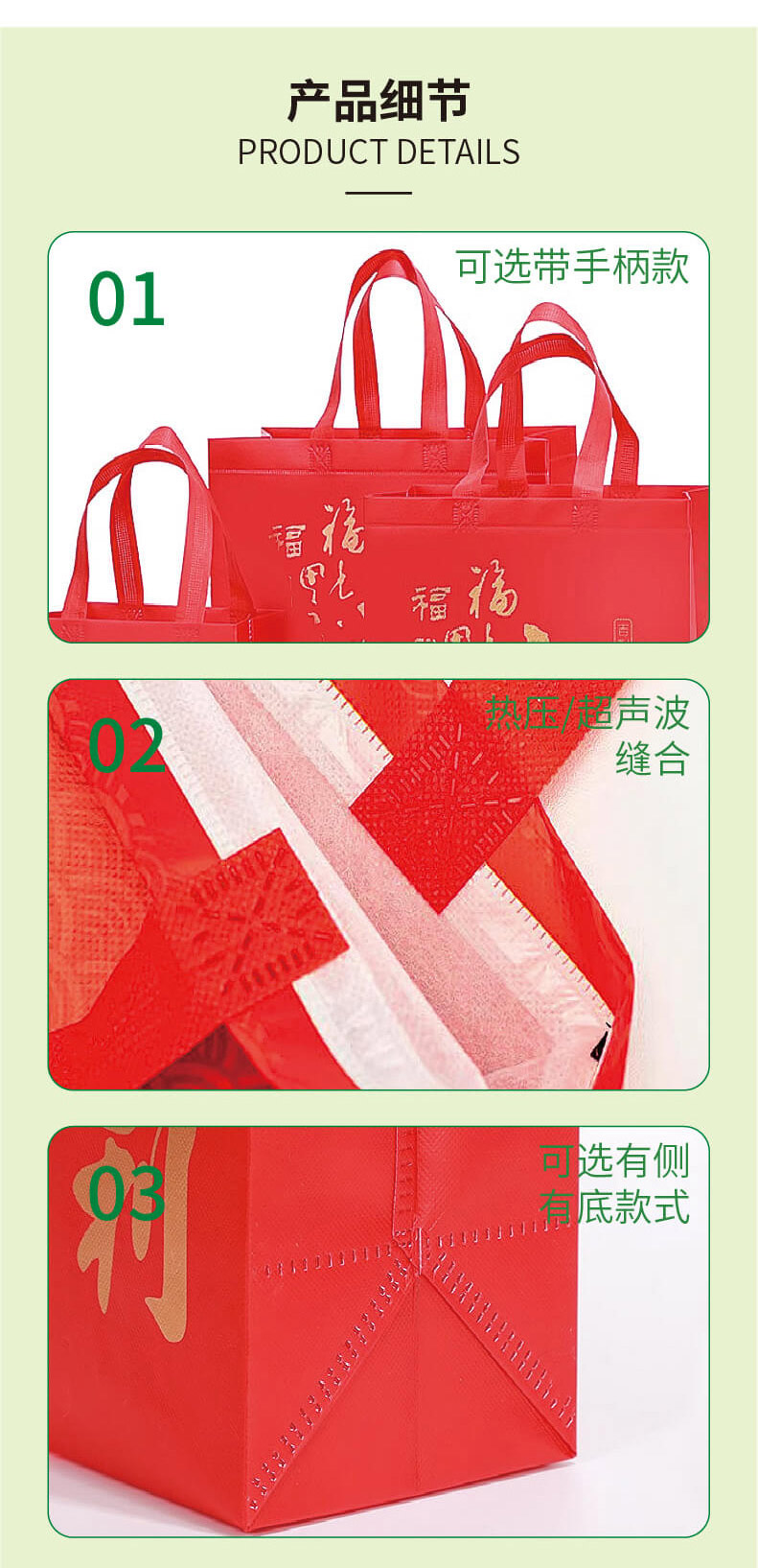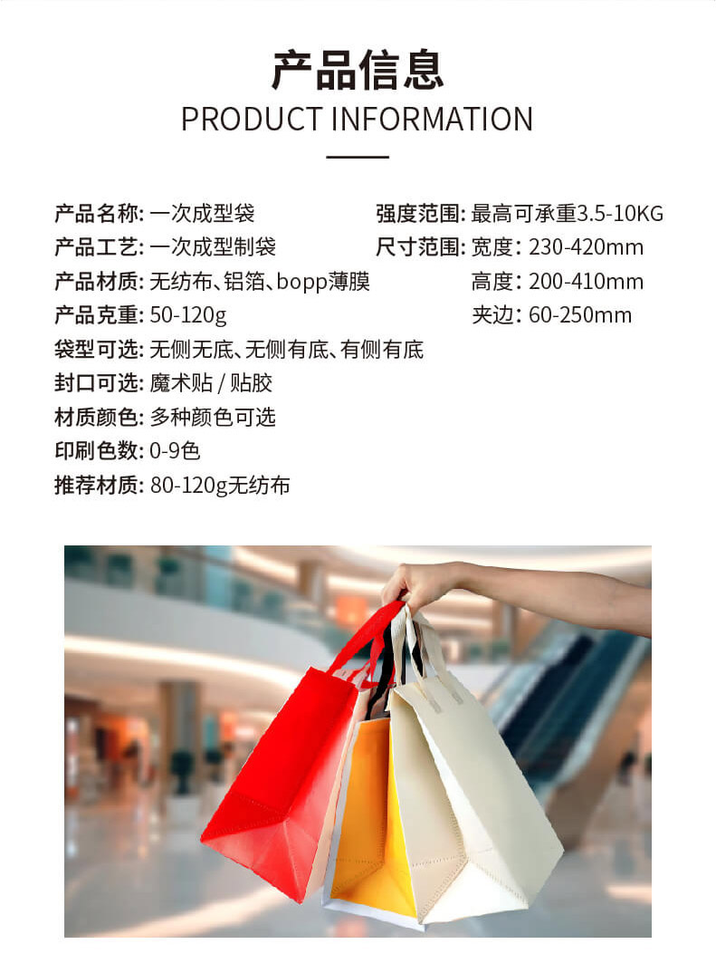 一次成型袋分为平口系列和可封口系列。平口系列中有四指袋、手提袋等;可封口系列中有双高口袋和高低口袋。一次成型袋全机械化制袋效率高、质量稳定有保证;采用一次成型、超声波缝合工艺。产品使用兼容面广泛,可应用于各类零售、商超等场景。